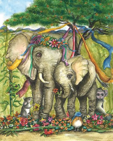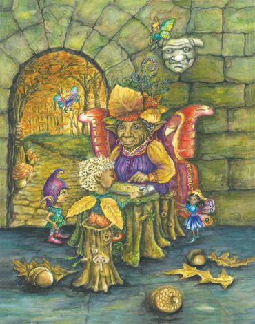 Forest Dreams. This painting was inspired by one of my Shamanic Visions in which my totem, Bear asked me to make myself as receptive as a cup and to integrate all the messages I had received from various other totems on my journey. Note the presence of "real" animals and their plush counterparts in the basket bed.
